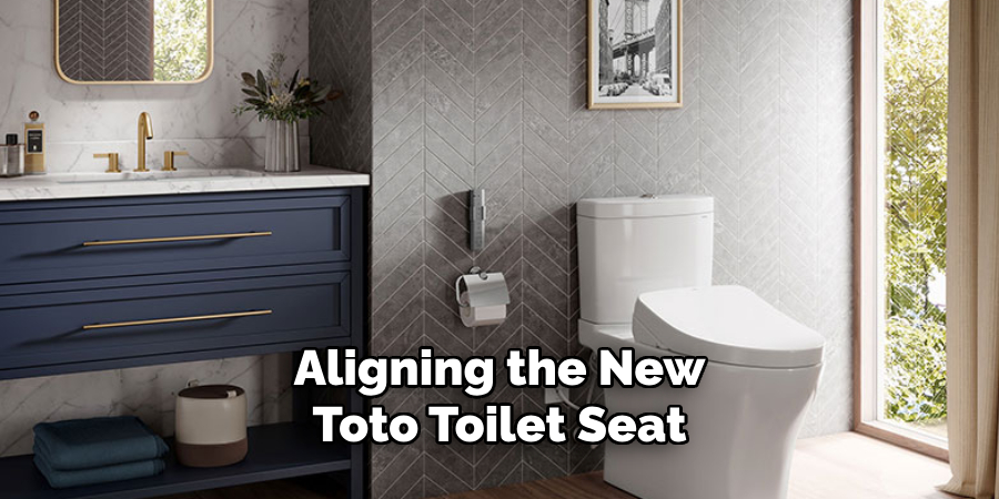 Begin by aligning the new Toto toilet seat with the mounting holes on the toilet bowl. Make sure the seat is centered correctly and positioned so it fits snugly and evenly over the bowl.